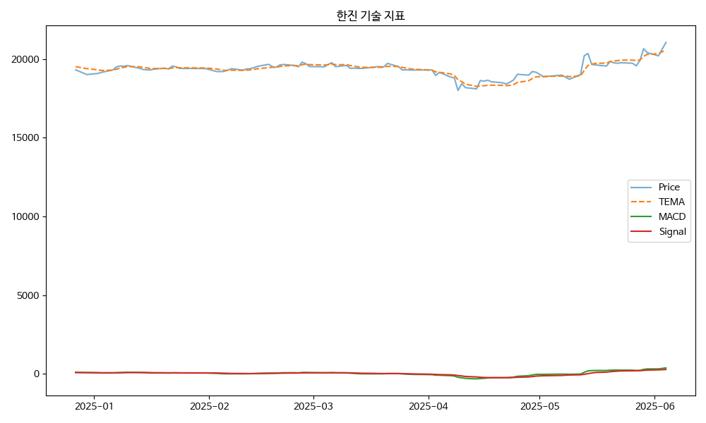 한진 🛫 MACD 상승 신호 + TEMA 상회 → 주가 우상향 가능성