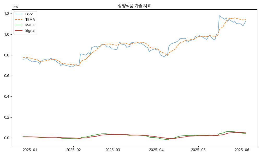 삼양식품의 주식은 최근에 미국의 신용등급 강등과 대선 공약 테마주의 영향을 받아 등락을 겪었습니다. 특히 불닭볶음면의 대박으로 황제주로 떠오른 삼양식품은 주목받고 있습니다. 기술적으로는 Golden Cross와 MA Ratio 등의 지표가 상승세를 보이고 있으며, BB Width와 Force Index, Elder Bear 등의 지표도 긍정적인 신호를 보여주고 있습니다.