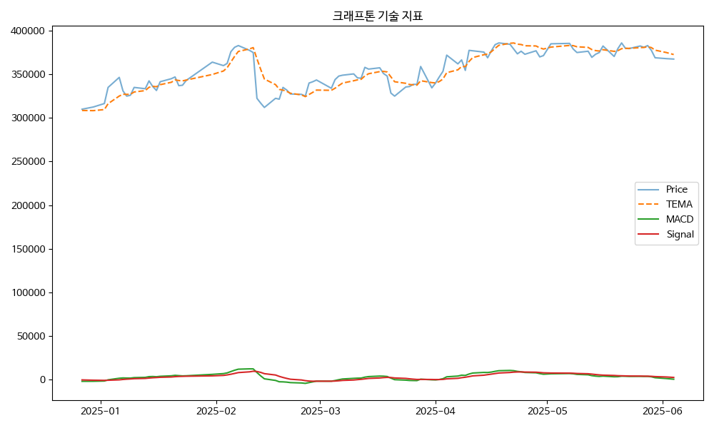 - TEMA: 현재가 367500.00, TEMA 372697.08 → 하락 흐름