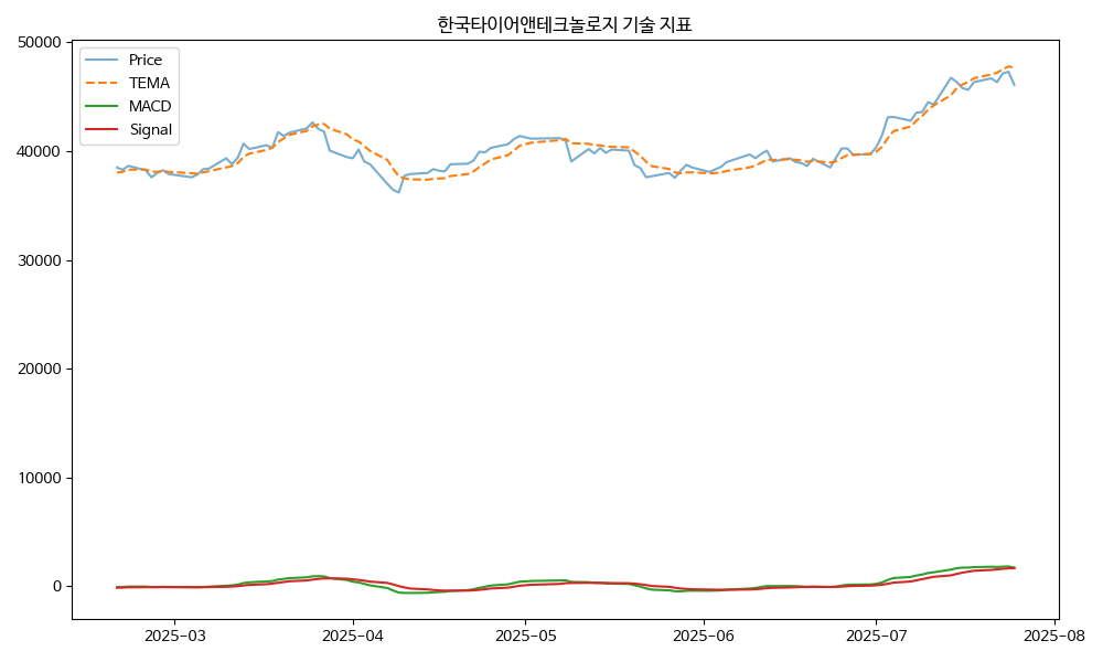 - TEMA: 현재가 46100.00, TEMA 47674.68 → 하락 흐름
