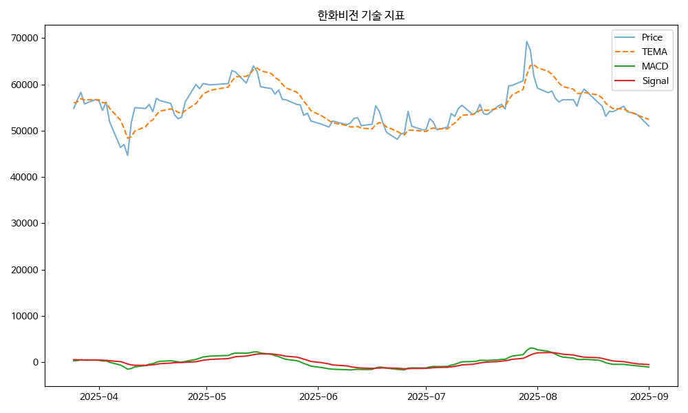 - TEMA: 현재가 51000.00, TEMA 52434.98 → 하락 흐름