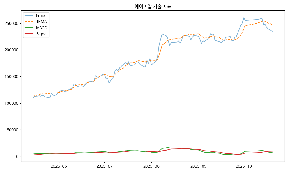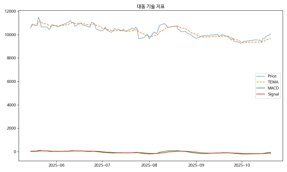 - TEMA: 현재가 10040.00, TEMA 9669.05 → 상승 흐름