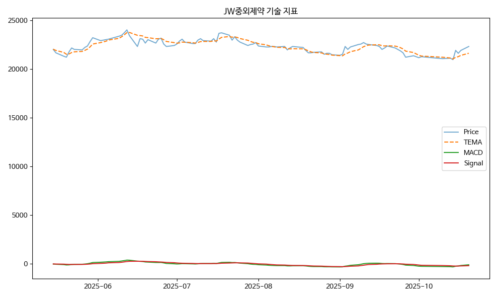 - TEMA: 현재가 22300.00, TEMA 21604.74 → 상승 흐름