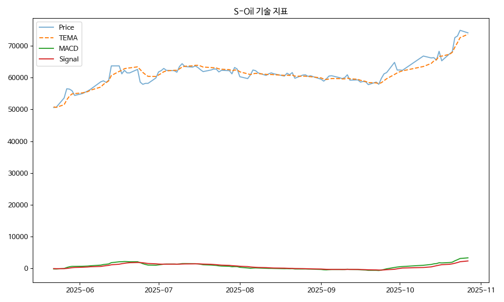 - TEMA: 현재가 74100.00, TEMA 73643.40 → 상승 흐름