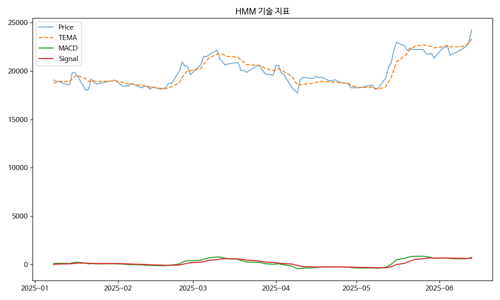 또한, 최근 뉴스의 감성 점수는 0.47로 긍정적인 반응을 보이고 있습니다. 이러한 흐름을 고려할 때, HMM 주식은 투자하기에 좋은 기회일 수 있습니다. 하지만 RSI나 MACD와 같은 추가적인 기술 지표를 확인해보는 것도 중요합니다.