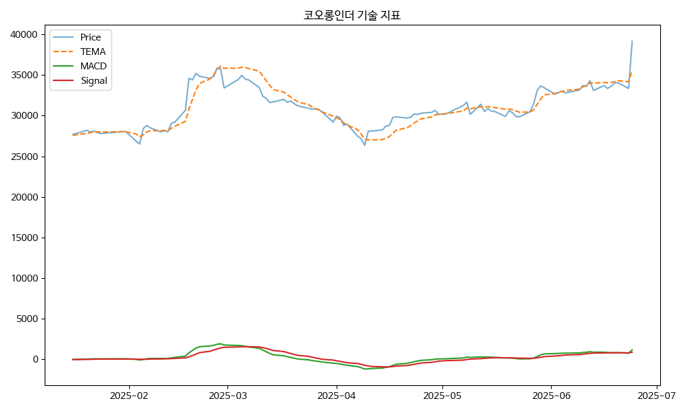 - TEMA: 현재가 39150.00, TEMA 35576.15 → 상승 흐름