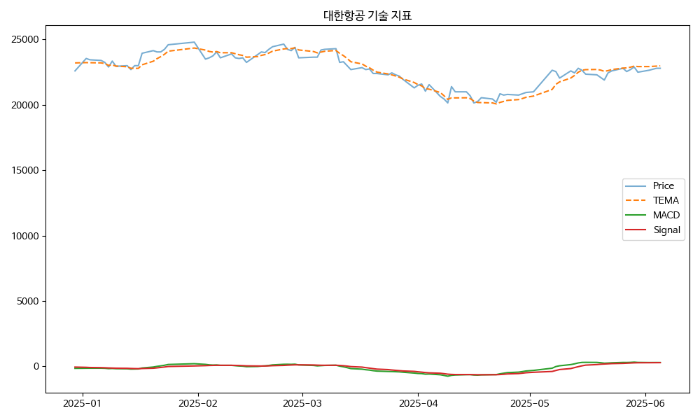 - TEMA: 현재가 21600.00, TEMA 22480.60 → 하락 흐름