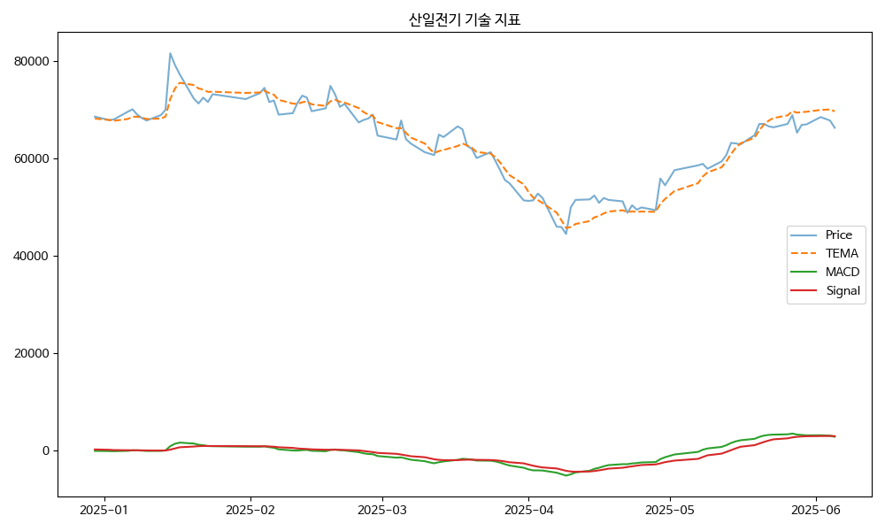산일전기는 전기제어 시스템을 전문적으로 제조하는 기업으로, 변압기와 같은 제품을 주력으로 생산하고 있습니다. 최근 매니저의 HOT종목으로 손꼽히며 관심을 받고 있습니다. 기술 지표에서는 Golden_Cross, MA_Ratio, Force_Index, BB_Width, %D 등이 주요한 지표로 나타났습니다.
