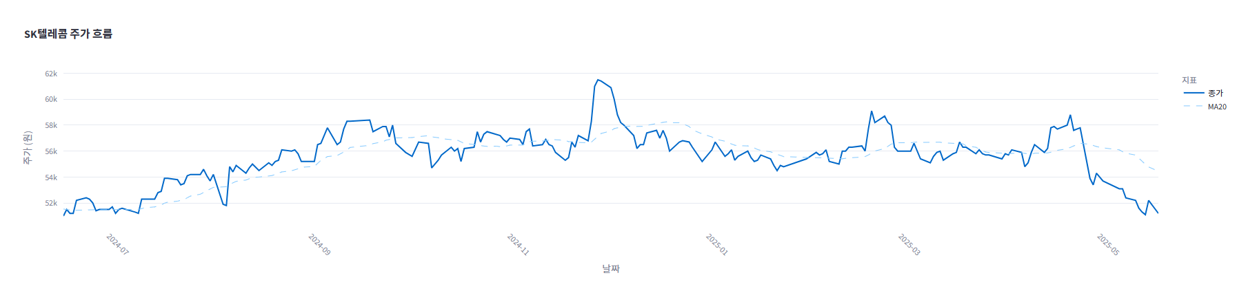 📅 2025년 06월 16일 | TINA 투자리포트📊 이 리포트는 기술적 지표 + 뉴스 감성 분석 + 머신러닝 기반 점수화로 선정된 종목입니다.📊 상위 5개 추천 종목 요약종목현재가AI 점수RSIMACD 신호시장 심리SK텔레콤54,600원0.5883.93상승0.48LG화학208,500원0.5870.96상승0.47삼성생명124,800원0.5482.88상승0.47LG디스플레이8,840원0.5465.85상승0.48HMM24,200원0.5366.95상승0.47🔹 SK텔레콤현재 주가: 54,600원보수적 매수: 52,962원공격적 매수: 53,781원보수적 매도: 59,525원공격적 매도: 55,419원손절가: 51,870원시장 심리: 0.48종합 점수: 0.58💡 AI 점수 해석: AI 점수는 보완이 ..