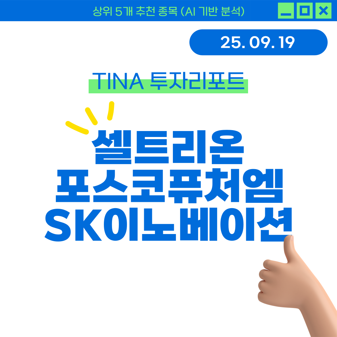📅 2025년 09월 19일 | TINA 투자리포트📊 이 리포트는 기술적 지표 + 뉴스 감성 분석 + 머신러닝 기반 점수화로 선정된 종목입니다.📊 상위 5개 추천 종목 요약종목현재가AI 점수RSIMACD 신호시장 심리셀트리온168,500원0.753.19하락1포스코퓨처엠139,600원0.6947.1상승1SK이노베이션106,700원0.6967.68상승1한화에어로스페이스1,023,000원0.6976.03상승1롯데정밀화학48,900원0.6684.95상승1🔹 셀트리온현재 주가: 168,500원보수적 매수: 163,445원공격적 매수: 165,972원보수적 매도: 183,827원공격적 매도: 171,027원손절가: 160,075원시장 심리: 1.00종합 점수: 0.70💡 AI 점수 해석: AI 점수는 전체..