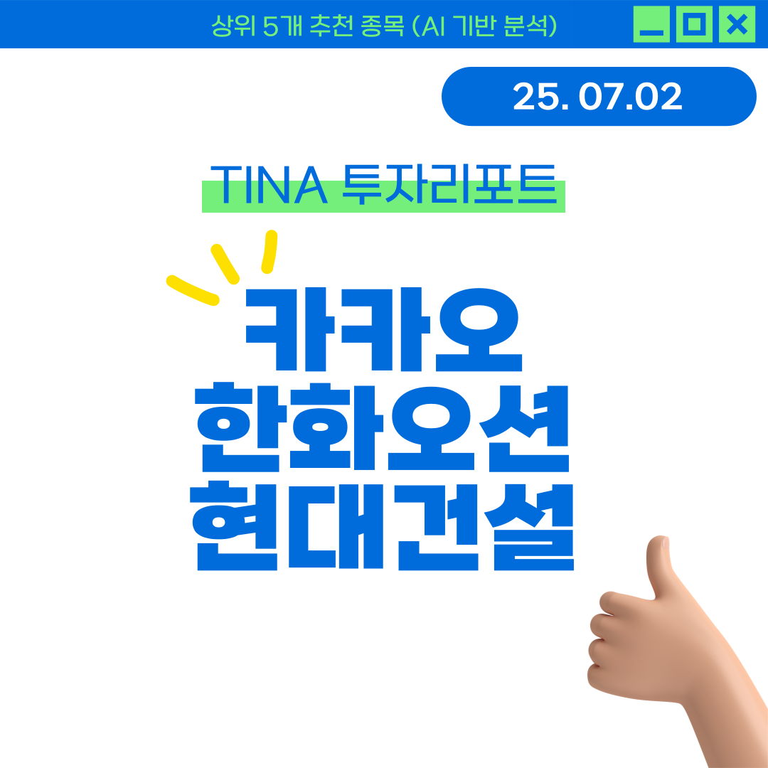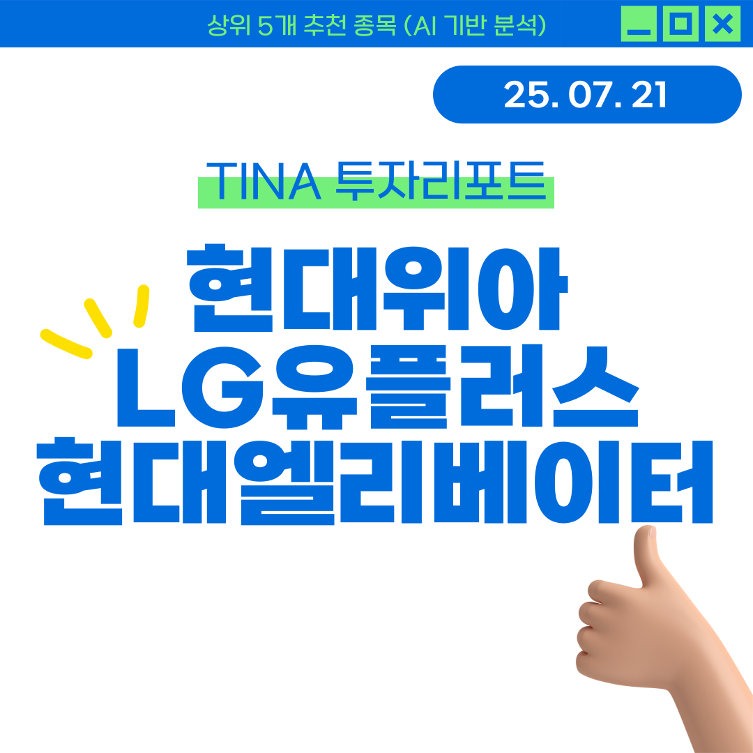 📅 2025년 07월 21일 | TINA 투자리포트📊 이 리포트는 기술적 지표 + 뉴스 감성 분석 + 머신러닝 기반 점수화로 선정된 종목입니다.📊 상위 5개 추천 종목 요약종목현재가AI 점수RSIMACD 신호시장 심리현대위아51,000원0.6571.67상승1LG유플러스14,990원0.6566.67하락1현대엘리베이터85,400원0.6448.81하락0.86미래에셋증권20,700원0.6145.63하락0.5유한양행132,000원0.679.96상승1🔹 현대위아현재 주가: 51,000원보수적 매수: 45,900원공격적 매수: 50,235원보수적 매도: 52,785원공격적 매도: 51,765원손절가: 48,450원시장 심리: 1.00종합 점수: 0.65💡 AI 점수 해석: AI 점수는 평균 이상으로 투자 고..
