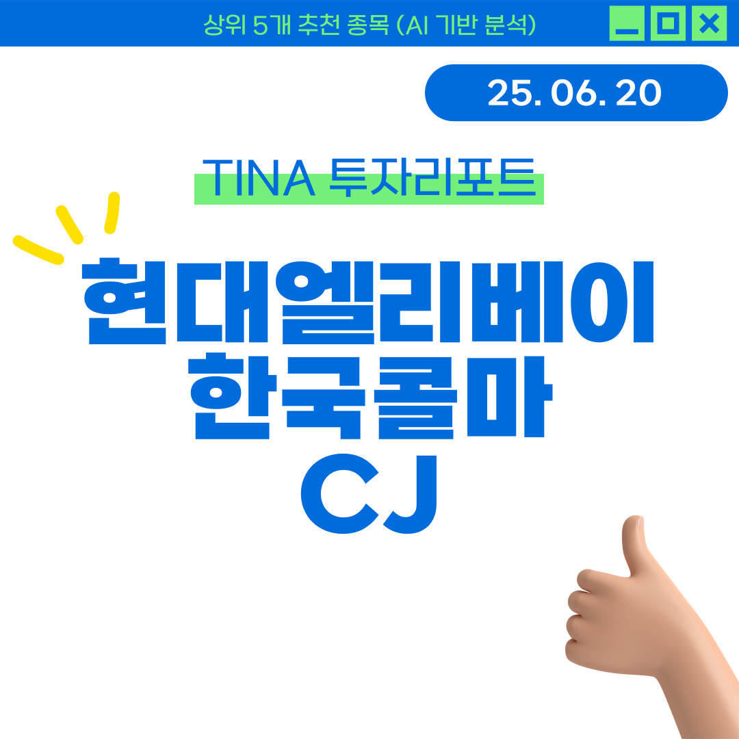 [TINA 투자리포트] 25년 6월 20일 추천 종목은 현대엘리베이터, 한국콜마, CJ