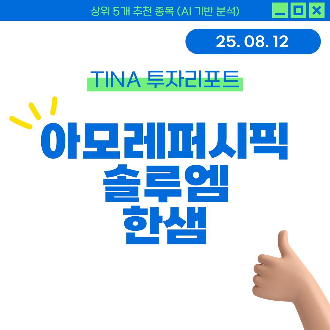 📅 2025년 09월 24일 | TINA 투자리포트📊 이 리포트는 기술적 지표 + 뉴스 감성 분석 + 머신러닝 기반 점수화로 선정된 종목입니다.📊 상위 5개 추천 종목 요약종목현재가AI 점수RSIMACD 신호시장 심리아모레퍼시픽123,400원0.6971.03상승0.98SK오션플랜트26,300원0.6764.9하락0.97GS건설18,930원0.6764.83상승1해성디에스30,250원0.6696.53상승1삼화전기40,100원0.6584.02상승1🔹 아모레퍼시픽현재 주가: 123,400원보수적 매수: 119,698원공격적 매수: 121,549원보수적 매도: 139,153원공격적 매도: 125,251원손절가: 117,230원시장 심리: 0.98종합 점수: 0.69💡 AI 점수 해석: AI 점수는 평균 이..