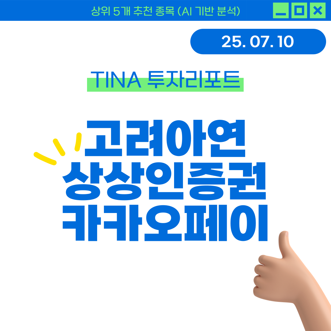 📅 2025년 10월 30일 | TINA 투자리포트📊 이 리포트는 기술적 지표 + 뉴스 감성 분석 + 머신러닝 기반 점수화로 선정된 종목입니다.📊 상위 5개 추천 종목 요약종목현재가AI 점수RSIMACD 신호시장 심리한올바이오파마34,500원0.7150하락0.9셀트리온176,600원0.7151.86상승1세진중공업22,800원0.6957.97상승1현대자동차258,000원0.6877.14상승1솔루스첨단소재9,480원0.6881.56상승1🔹 한올바이오파마현재 주가: 34,500원보수적 매수: 31,050원공격적 매수: 33,982원보수적 매도: 35,708원공격적 매도: 35,018원손절가: 32,775원시장 심리: 0.90종합 점수: 0.71💡 AI 점수 해석: AI 점수는 전체 분석 결과 상위 5..